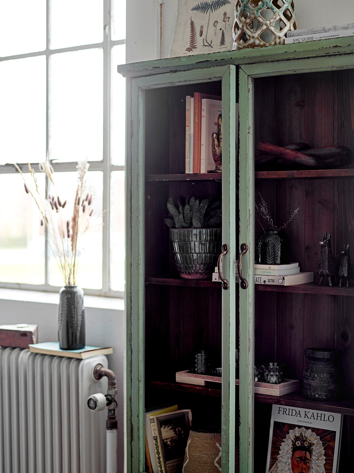 Med målene L81 x H122 x W22 cm tilbyder skabet rigelig plads, uden at virke tungt i indretningen. Den gennemtænkte dybde gør det muligt at bruge det som både opbevarings- og udstillingsskab, og den grønne nuance tilføjer en rolig, nostalgisk stemning, der passer perfekt ind i tidens trend med naturlige og varme farver.