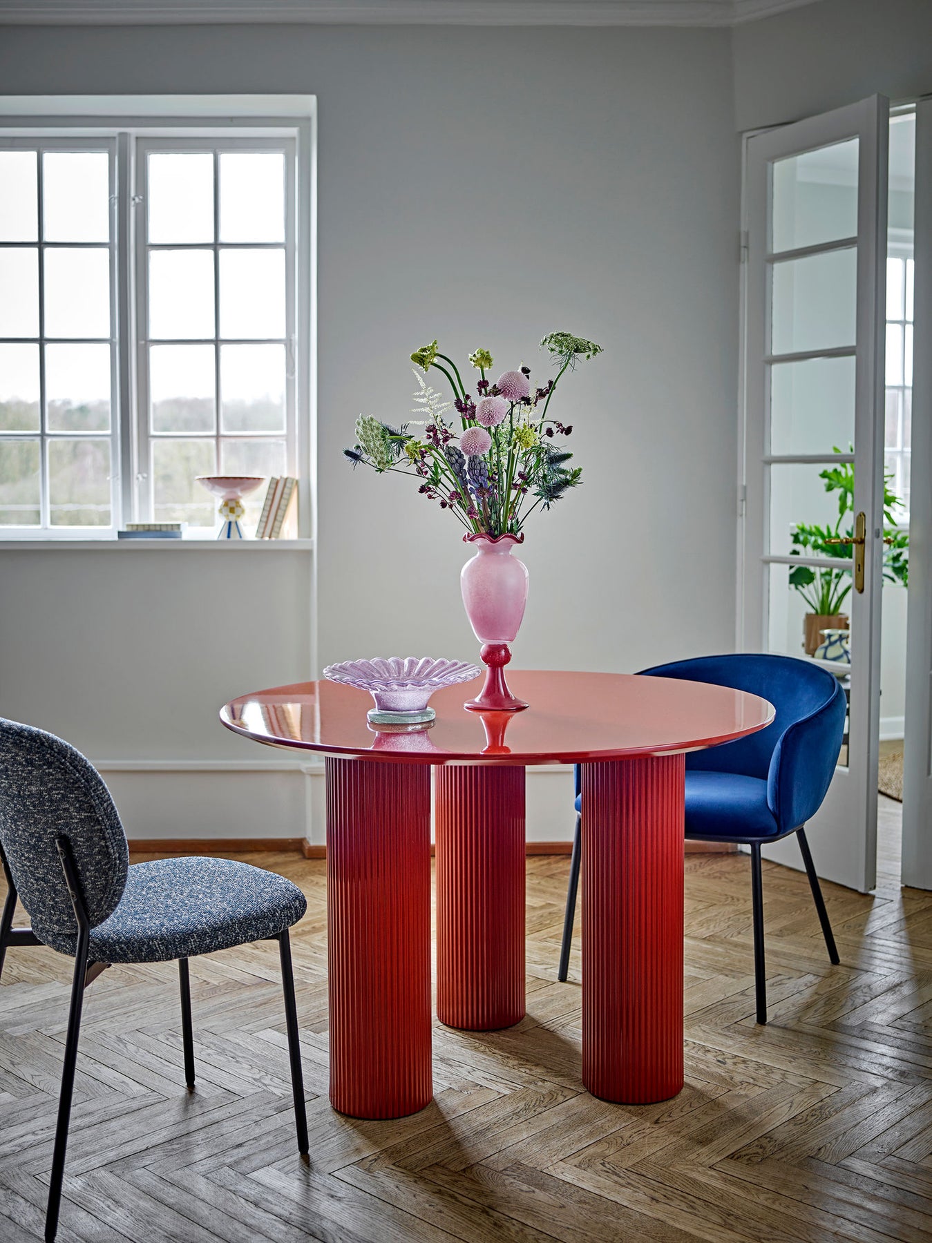 Della Spisebordet fra Bloomingville er et rundt bord med en rød MDF-bordplade, lakeret i højglans. Tre riflede cylindriske ben danner en skulpturel base, der giver bordet et afbalanceret og solidt udtryk med et raffineret, moderne præg.