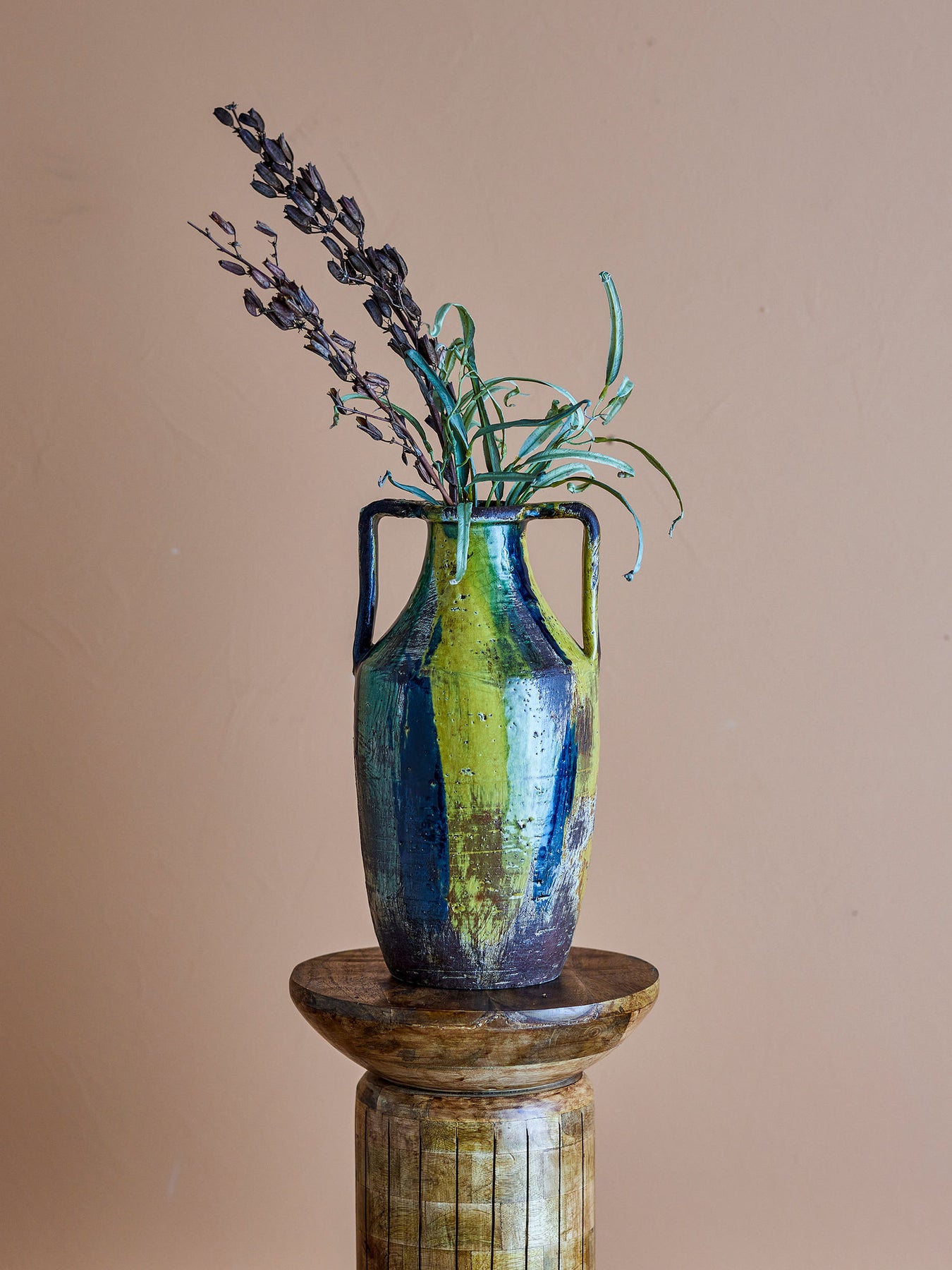 Wilder Vasen fra Creative Collection er en smuk hånddekoreret vase, lavet af terrakotta. Vasen er udstyret med to praktiske håndtag og har et unikt farvespil, der giver den et rustikt udtryk. Hver vase er hånddekoreret, hvilket betyder, at ingen vaser er ens. Perfekt til at fremvise dine yndlingsblomster eller som et selvstændigt kunstværk i hjemmet.